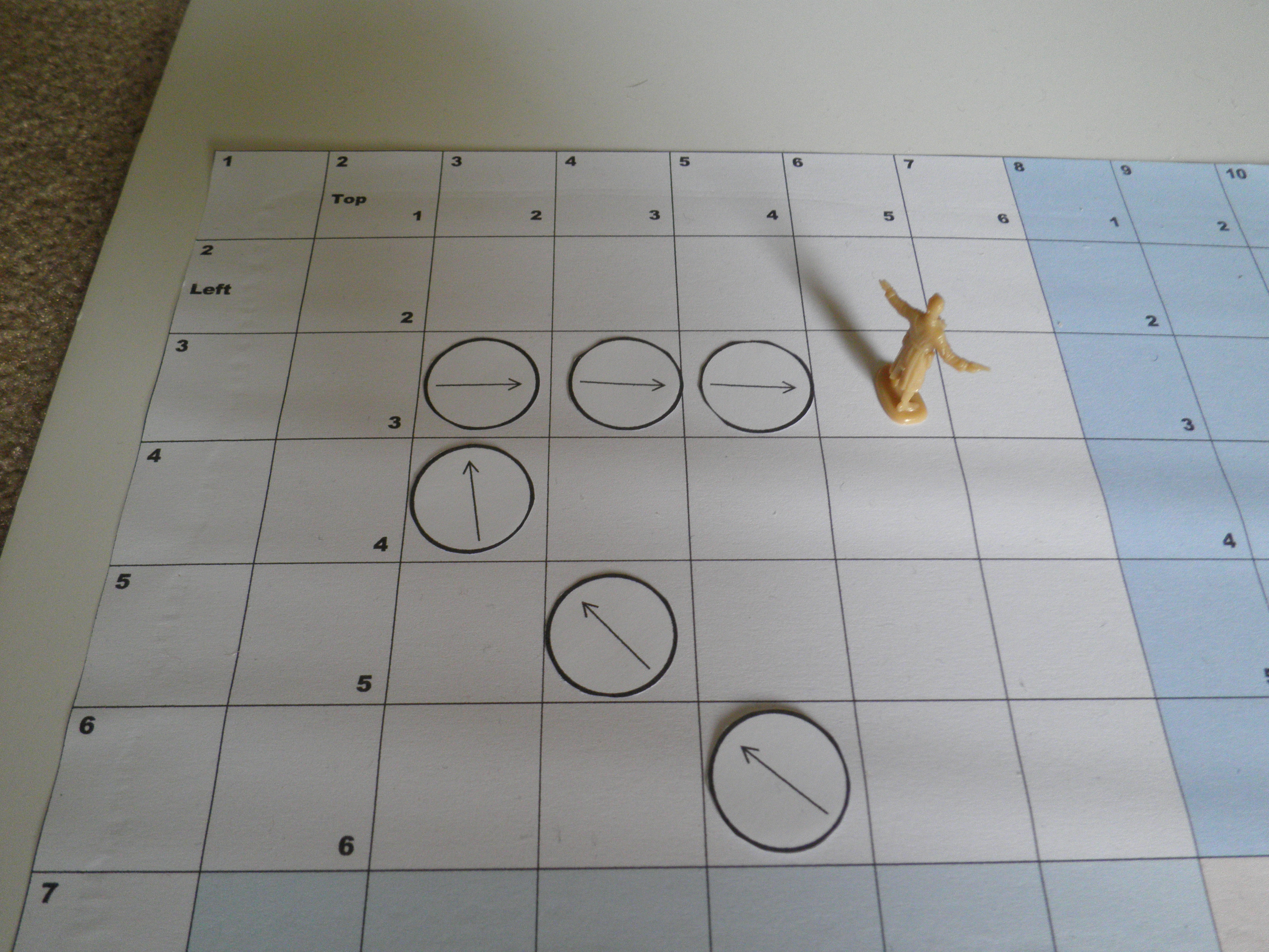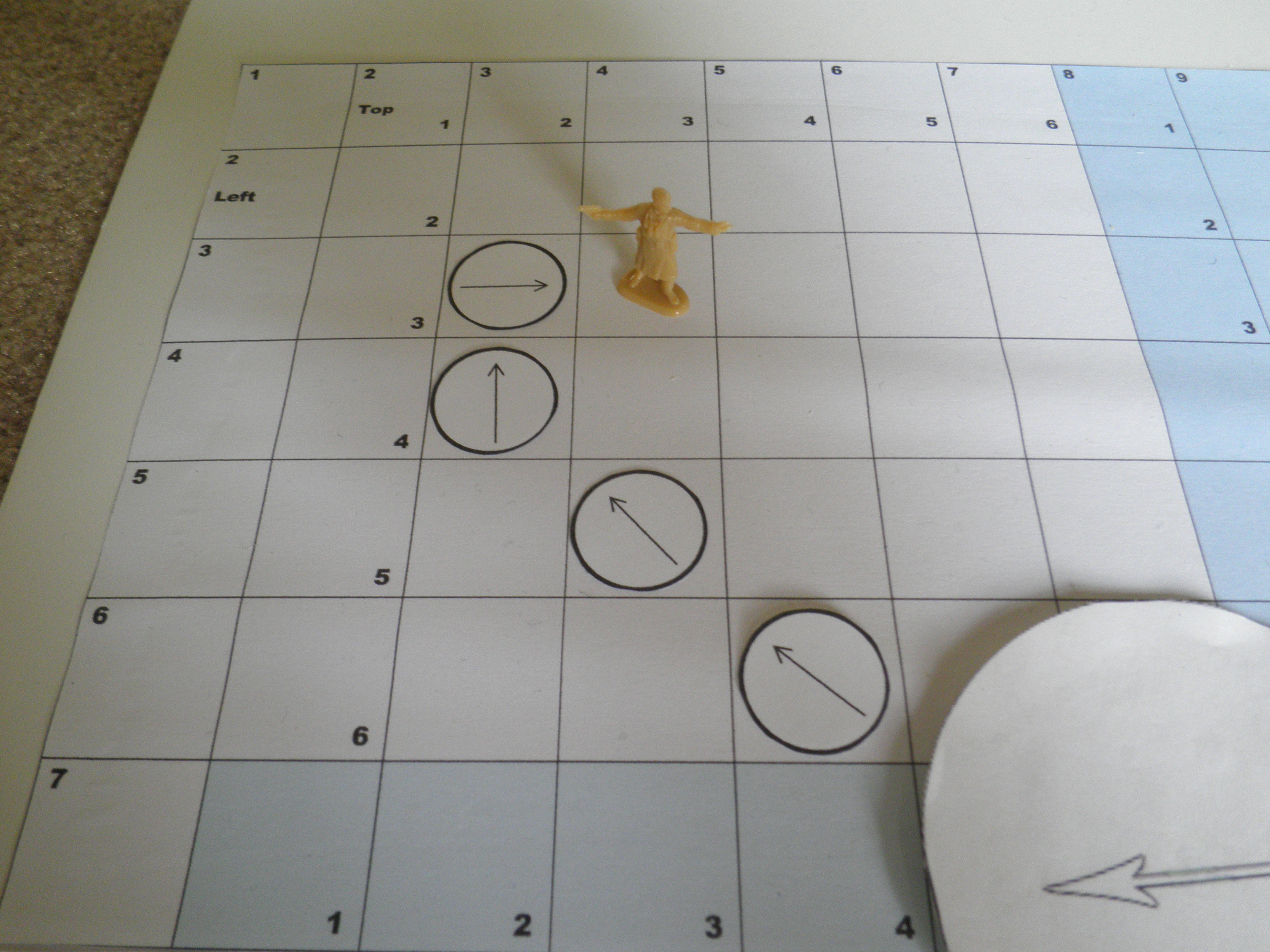 The player starts here.The player moves out of the first square; the marker shows the direction in which the player moved.The player keeps moving, the markers keep tracking.As the player turns, the trail turns as well.The trail always turns to follow the player.The searcher approaches, facing in direction 3–to the left.The searcher encounters the trail and turns to face in the direction it indicates.As the searcher moves, it encounters the trail marker pointing in a different direction. It turns to face in the new direction.If the trail looks like this . . . .The searcher moves forward, hits three markers at the same time, and relies on the one “topmost” and closest to the center–the one at (5,3). It turns right, the direction of that marker.