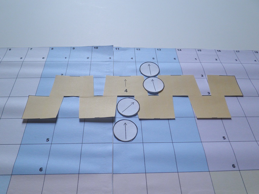 Take a look at piece 6. It’s a 5×3 block. Moving across it vertically will bog a player down for an entire turn, plus part of a second. Getting across it horizontally is . . . well, suffice it to say that that’s not a good tactical move.
