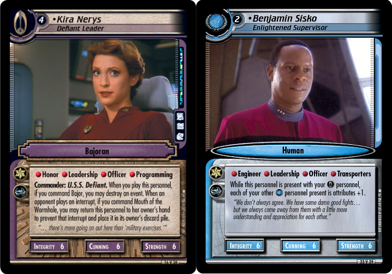 The Star Trek CCG’s first edition (“1E”) divided its personnel according to Star Trek’s fiction. Romulans could only work with other Romulans as a rule; Cardassians were found in crews with other Cardassians; the Dominion kept to itself, running fully Dominion-staffed vessels. Federation citizens, including most of the main cast of the Star Trek TV shows, were happy to team up—Captain Kirk and Mr. Tuvok were both members of Starfleet, after all—but generally speaking the game prevented them from teaming up with non-Federation citizens, like Klingons or the Bajorans.