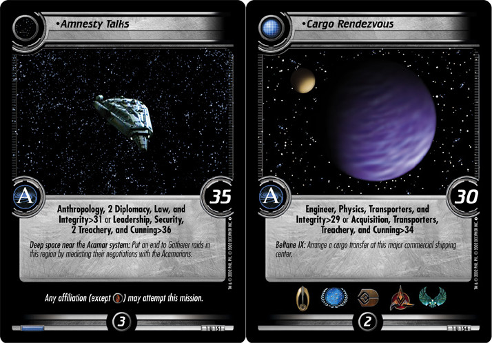 The primary means for getting points—completing missions—was also a problem, in several respects. First, the missions tended to be things the characters might do in-universe: investigate a mysterious space probe, respond to a distress call, etc. As a result, while most cards were driven by narrative the actual stuff one did with the cards was all about in-character simulation. That led to odd, athematic moments like Klingons participating in amnesty talks or organizing a cargo rendezvous; I’m sure there are Klingons who do those things, but they don’t fit the role of the Klingon Empire in the story, and after playing a bunch of cards meant to “feel Klingon” it was unfortunate to then use them to do un-Klingon-feeling things.